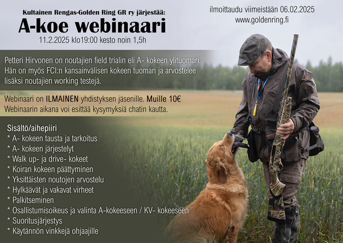 Kultainen Rengas - Golden Ring GR ry järjestää jäsenilleen ILMAISEN A-koe webinaarin.